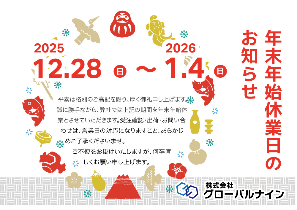平素は格別のお引き立てを賜り誠に有難うございます。当社では上記日程のとおり年末年始