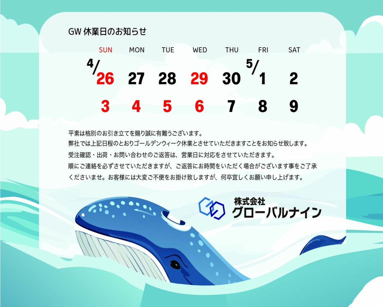 弊社では下記日程をゴールデンウィーク休業とさせていただきますことをお知らせいたします。